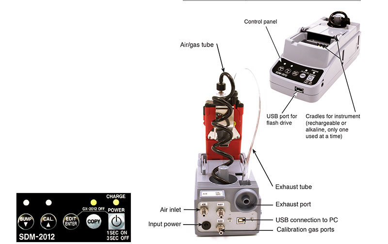 The SDM-2012 is a versatile maintenance tool that automates the service of a GX-2012 portable gas monitor. This docking station can be used as a Stand-Alone device for charging, calibration and bump testing, with all records stored automatically for future upload to a PC via USB flash drive (PC software and flash drive included).