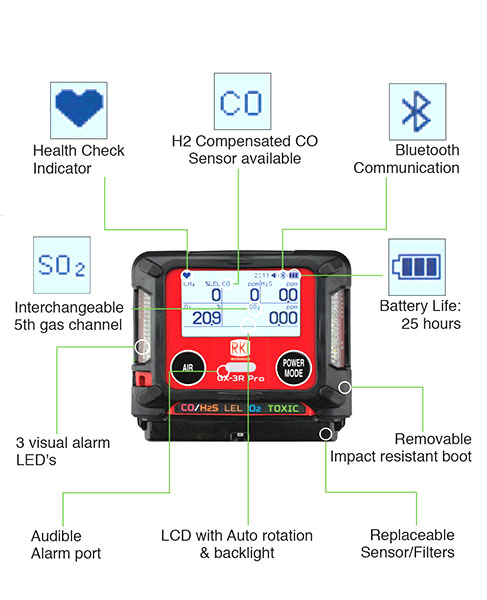 The GX-3R Pro is the world's smallest 5-gas monitor weighing only 4.58 ounces and fits in the palm of your hand (2.9" W x 2.6" H x 1.06" D). It simultaneously monitors and displays 5 different gases. In addition to monitoring standard confined space gases, LEL, O2, CO, and H2S, the GX-3R Pro has a 5th channel where you can add infrared or toxic gas sensors.